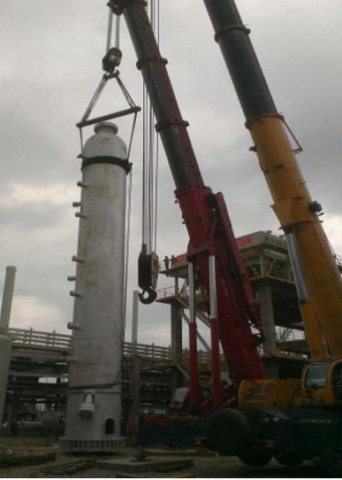 這樣的笑容來之不易。3臺反應器,最高的有19米多,單臺重量最大達到141余噸。總包單位在設計的時候未考慮吊耳。由于材質特殊,也無法在設備上施焊增加吊耳,這是最棘手的。總包單位束手無策,但又不同意項目部提出采用鋼絲繩捆綁式的吊裝方案,猶豫著不愿意簽字,萬一有個失誤,后果不堪設想!