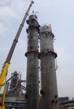 中午,吊車第二次移位,準(zhǔn)備吊裝高7.9米(總高44.6米)、重17噸的洗苯塔上節(jié)。下午2點,洗苯塔上節(jié)開始組對焊接,至下午4點順利完成。吊車進行第三次移位,準(zhǔn)備吊裝高21米、重39.5噸的水洗塔。5點30分,水洗塔順利完成吊裝。