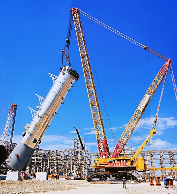 自今年920日以來, 苯乙烯項目部共成功吊裝第一脫氫換熱器、三聯換熱器、轉烷基化反應器、苯處理器、多乙苯塔、苯/甲苯塔等大型設備13臺,吊裝總噸位約達2000噸。其中,最重設備三聯換熱器重687噸,高41米,最大吊裝高度63米;而這次吊裝的低壓粗苯乙烯塔,塔體總高度92.2米,重量950噸,是整個大型設備吊裝中最復雜的設備之一,分兩段運至施工現場,由2000噸吊車吊起來空中組對、焊接。