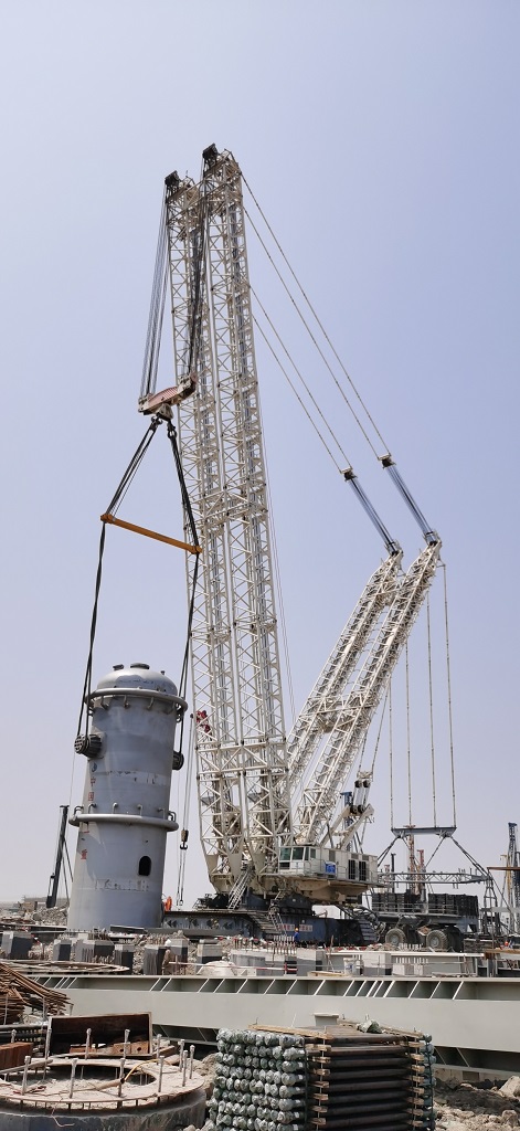 該EO反應(yīng)器為乙二醇裝置單體最重設(shè)備,設(shè)備凈重1128噸。江蘇分公司浙石化二期乙二醇裝置項(xiàng)目部施工人員采用由3200噸履帶吊主吊、280噸履帶吊溜尾進(jìn)行吊裝。經(jīng)過(guò)約2個(gè)多小時(shí)的起吊、平衡、轉(zhuǎn)體,上午11點(diǎn)16分順利就位,設(shè)備一次吊裝成功。