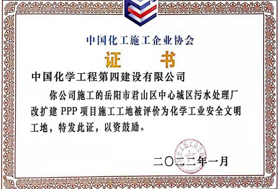 近日,從中國化工施工企業(yè)協(xié)會傳來喜訊,由市政工程公司承建的岳陽市君山區(qū)中心城區(qū)污水處理廠改擴(kuò)建PPP項目被評為“化學(xué)工業(yè)安全文明工地”稱號。