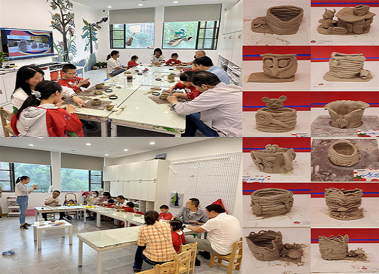 活動中,專業陶藝師帶領9組親子家庭對中國陶藝歷史文化進行講解,對陶藝的起源和發展有了一定的認識后進行體驗課程。陶藝師為親子家庭講解制作方法以及注意事項。小朋友們就迫不及待的制作起來,隨著一捏、一揉間,孩子們的整個動作都充滿童趣和自然美。陶泥是不定型的粘土,孩子們可以根據自己的想象與家長共同任意做出各種物品。不一會兒,花瓶、筆筒、動物等一件件惟妙惟肖的作品就展現在大家面前,看著自己親手制作的作品,孩子們興奮不已。活動還評選了創意獎數名,項目部為大家派發了“AI智能地球儀”、“樂高拼圖”等豐富孩子們學習生活的禮物。