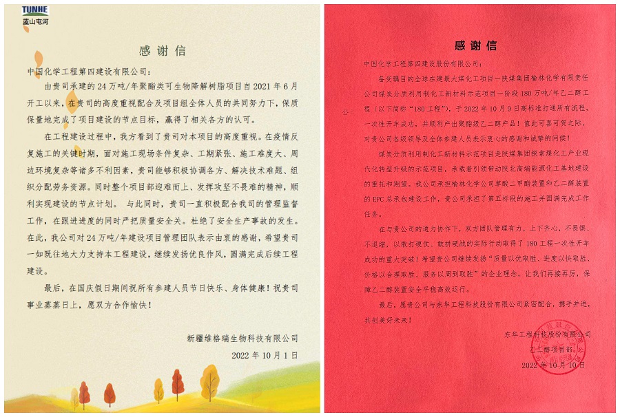 新疆藍(lán)山屯河等多家業(yè)主向公司發(fā)來(lái)感謝信