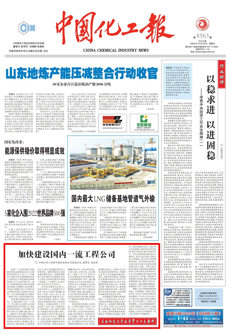 12月23日,《中國化工報》頭版全文刊登公司黨委書記、董事長胡流芳學(xué)習(xí)貫徹黨的二十大精神體會文章《加快建設(shè)國內(nèi)一流工程公司》,全文如下。