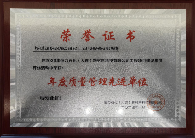 大連恒力項(xiàng)目部獲年度質(zhì)量管理先進(jìn)單位