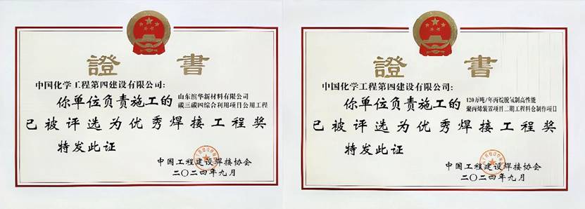 近日,從中國工程建設(shè)焊接協(xié)會傳來喜報,由公司申報的江西公司“山東濱華新材料有限公司碳三碳四綜合利用項目公用工程”和華北公司“120萬噸/年丙烷脫氫制高性能聚丙烯裝置項目二期工程料倉制作項目”分別榮獲2024年度優(yōu)秀焊接工程獎。