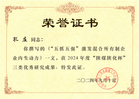孔莊撰寫的政研論文獲評2024年度“陜煤陜化杯”三類優(yōu)秀成果