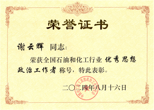 謝云輝獲評全國石油和化學(xué)工業(yè)優(yōu)秀思想政治工作者