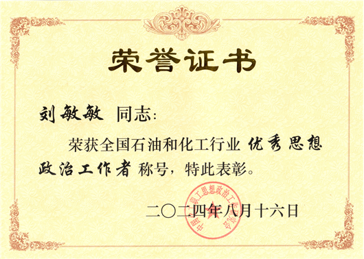 劉敏敏獲評全國石油和化學(xué)工業(yè)優(yōu)秀思想政治工作者