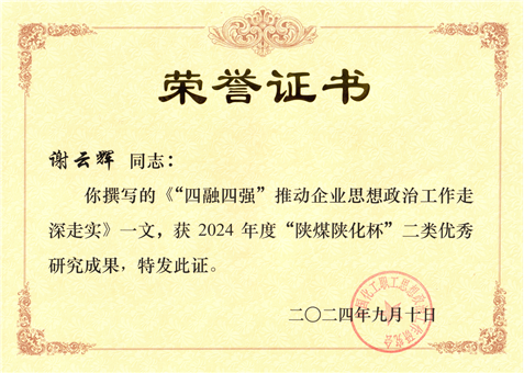 謝云輝撰寫的政研論文獲評2024年度“陜煤陜化杯”二類優(yōu)秀成果
