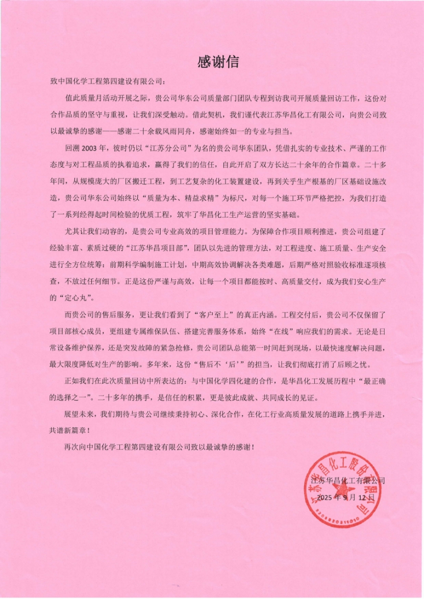 近日,在全國(guó)“質(zhì)量月”活動(dòng)開(kāi)展之際,華東公司收到江蘇華昌化工有限公司發(fā)來(lái)的感謝信。這份滿(mǎn)載認(rèn)可的信函,不僅是合作方對(duì)華東公司質(zhì)量管理工作的高度肯定,更成為雙方20余載風(fēng)雨同舟、攜手共進(jìn)的深厚合作情誼的生動(dòng)見(jiàn)證。