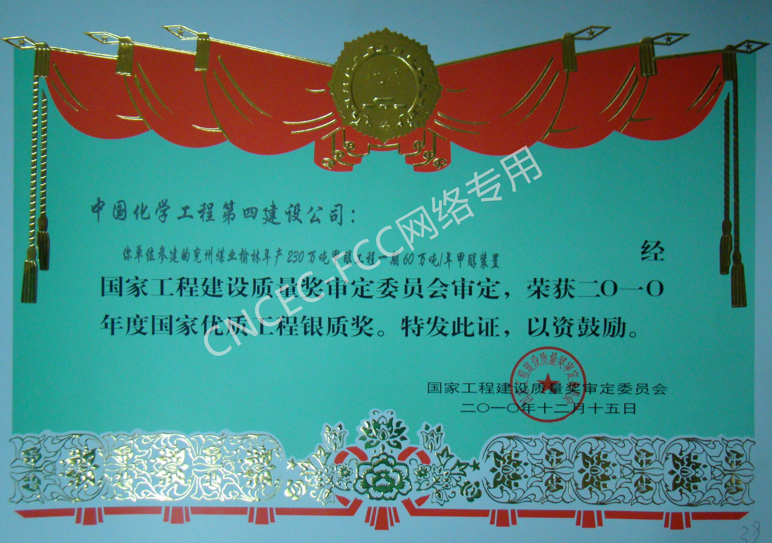 兗州煤業(yè)榆林年產230萬噸甲醇工程一期60萬噸年甲醇裝置國家優(yōu)質工程銀質獎